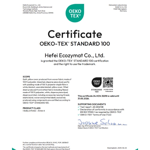 We hold the OEKO-TEX Standard 100 certification. If your brand requires specific flammability or fiber tests, we can facilitate third-party lab reporting based on your regional requirements.