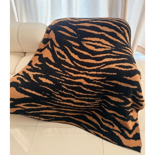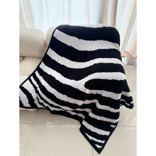 Signature zebra-patterned knit blanket made from premium 100% microfiber feather yarn. Featuring a double-sided jacquard weave and 4-way high-stretch flexibility. Designed for high-end boutique brands and gift wholesalers. Customizable colors and private labeling available.